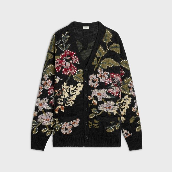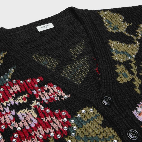 Langer Wollcardigan mit Blumenstickerei und Strasssteinen
